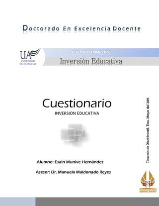 Este documento presenta un cuestionario para un doctorado en excelencia docente. Consiste en tres partes que abordan objetivos de investigación personal relacionados con temas como el rezago educativo en México, la calidad de la educación y los factores que influyen en la inversión educativa. El cuestionario incluye preguntas sobre las motivaciones para cursar el doctorado, líneas de investigación y definición conceptual de temas educativos.