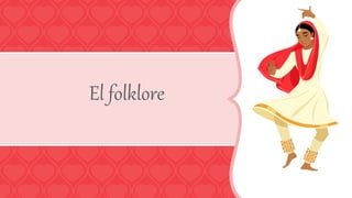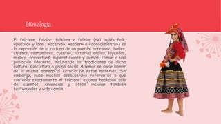 El folklore se refiere a la expresión cultural de un pueblo, incluyendo sus artesanías, bailes, cuentos, costumbres, historias orales, leyendas, música y supersticiones. El folklore ha sido influenciado por diferentes culturas a lo largo de la historia y se transmite de generación en generación dentro de una comunidad. Se refiere al conjunto de creencias, prácticas y tradiciones compartidas por un pueblo, como sus bailes, música, leyendas, cuentos, artesanías y supersticiones.
