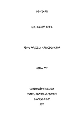 Este documento describe las propiedades y tipos de soluciones, incluyendo factores que afectan la solubilidad, métodos para expresar concentraciones, pH, indicadores de pH y coloides. Explica que una solución es una mezcla homogénea de un soluto y un solvente, y describe soluciones gaseosas, líquidas y sólidas. Además, detalla factores como la temperatura y agitación que afectan la solubilidad de un soluto.