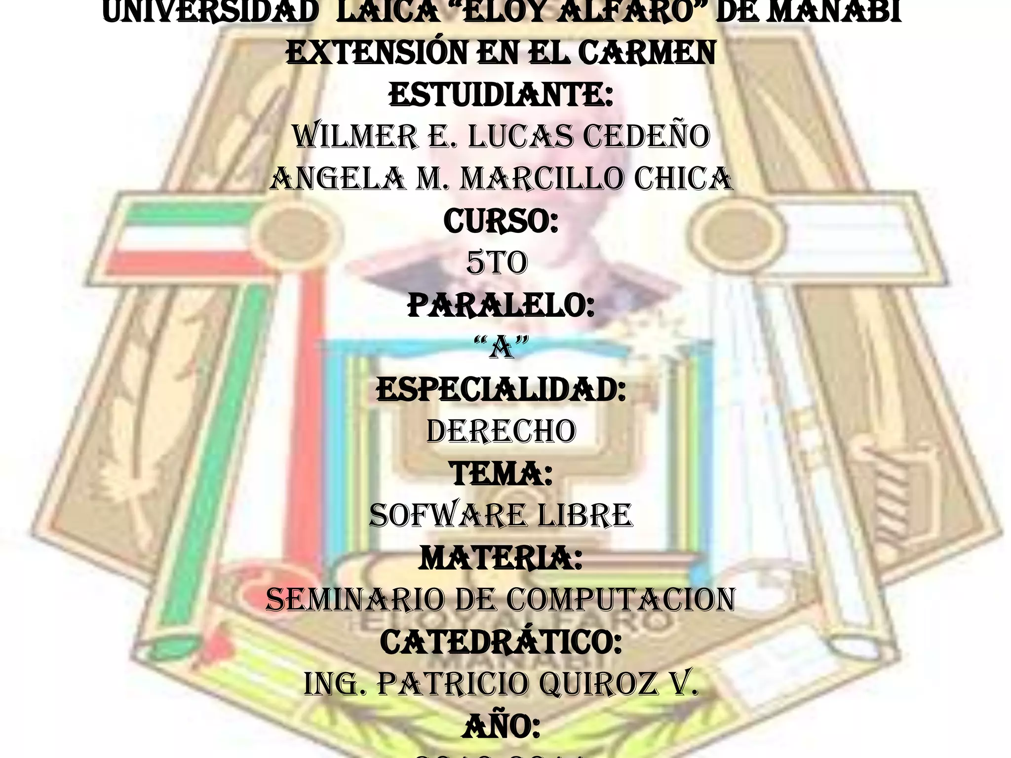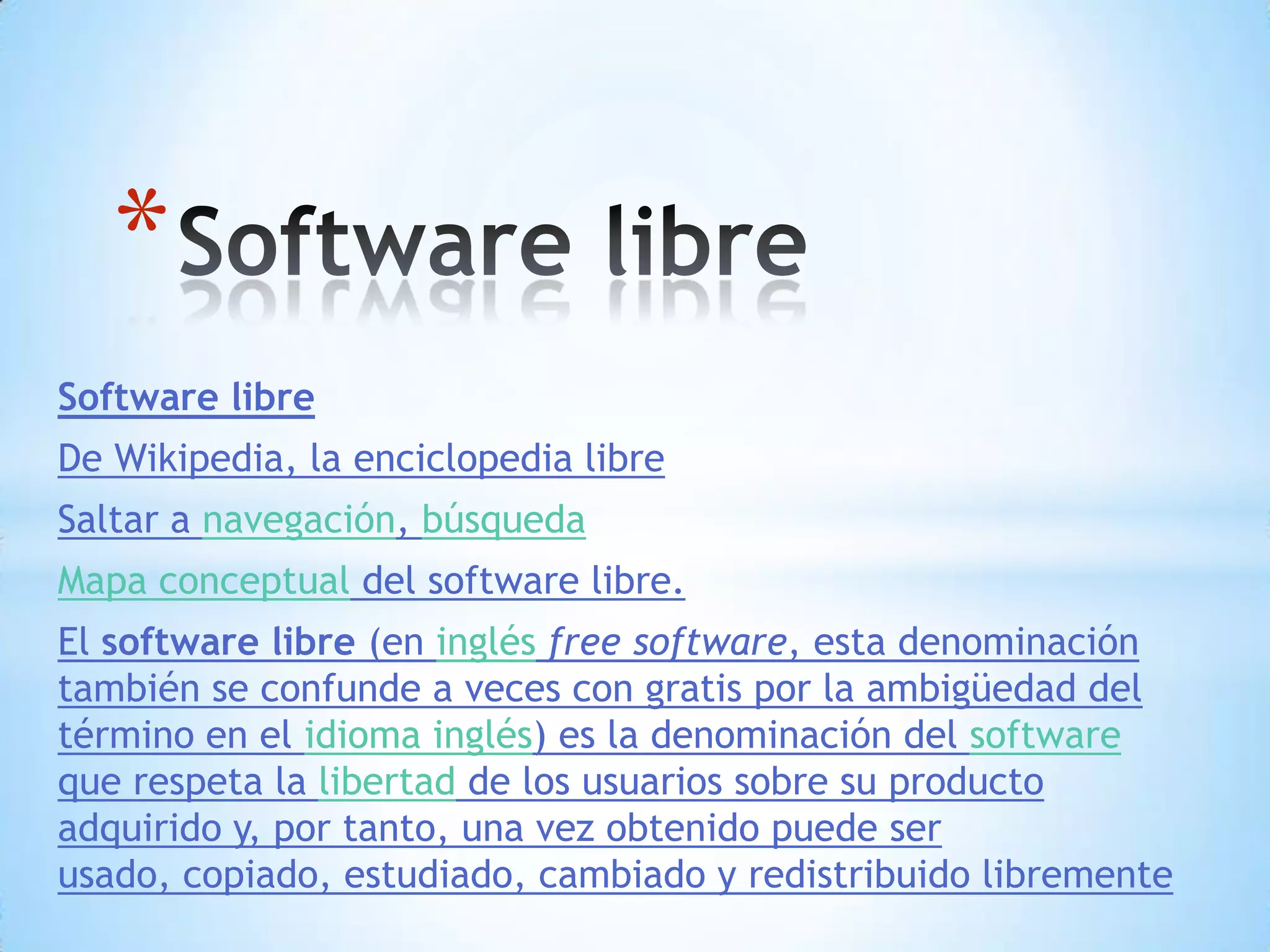 El documento habla sobre el software libre. Define el software libre como aquel que respeta la libertad de los usuarios para usar, copiar, estudiar, modificar y redistribuir el software libremente. Explica que el software libre puede distribuirse gratis o comercialmente y no debe confundirse con software gratuito o de dominio público. Brevemente describe la historia del software libre y cómo surgió como alternativa al software privativo en los años 1980.
