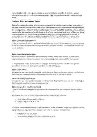 El documento define conceptos clave en investigación como datos, unidades de análisis, variables y valores. Explica que los datos son información extraída de la realidad que se registra y expresa a través de un lenguaje. Las unidades de análisis son los elementos mínimos que se estudian. Las variables son atributos o cualidades de las unidades que pueden asumir diferentes valores. Finalmente, las matrices de datos sistematizan la información recogida para investigar problemas mediante el método científico.