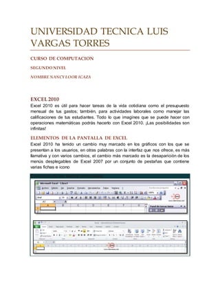 Este documento proporciona una introducción a Excel 2010, describiendo sus elementos principales, cómo combinar celdas, cambiar el nombre de una hoja y desplazarse entre celdas. Explica las barras de herramientas, pestañas e iconos en la interfaz de usuario de Excel 2010 y enumera 15 elementos clave de la hoja de cálculo. Además, describe cómo combinar celdas adyacentes para mostrar contenido, cambiar el nombre de una hoja haciendo clic con el botón derecho y usar las barras de desplazamiento y teclas de dire