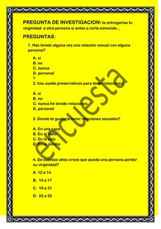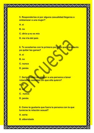 Este documento contiene 10 preguntas sobre relaciones sexuales y virginidad. Las preguntas cubren temas como la edad apropiada para perder la virginidad, el uso de protección, la responsabilidad en caso de embarazo y el consentimiento. Las respuestas ofrecidas son breves opciones como "sí", "no" u horarios específicos.