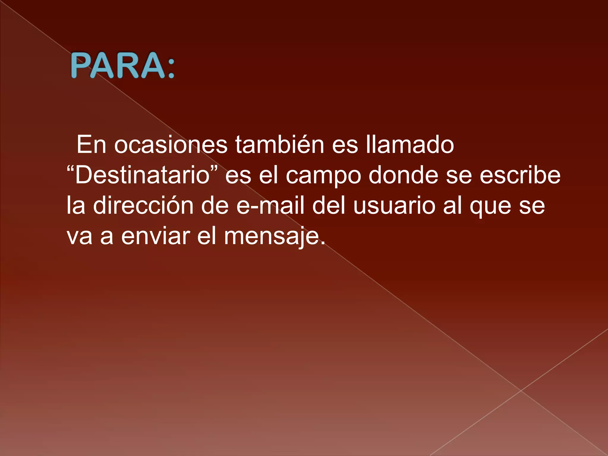 Este documento describe las funciones principales de un correo electrónico como el campo destinatario, con copia, con copia oculta, asunto, adjuntos, cuerpo del mensaje, firma y buzón de entrada. También explica cómo responder, reenviar, eliminar, mover a spam y recuperar mensajes.