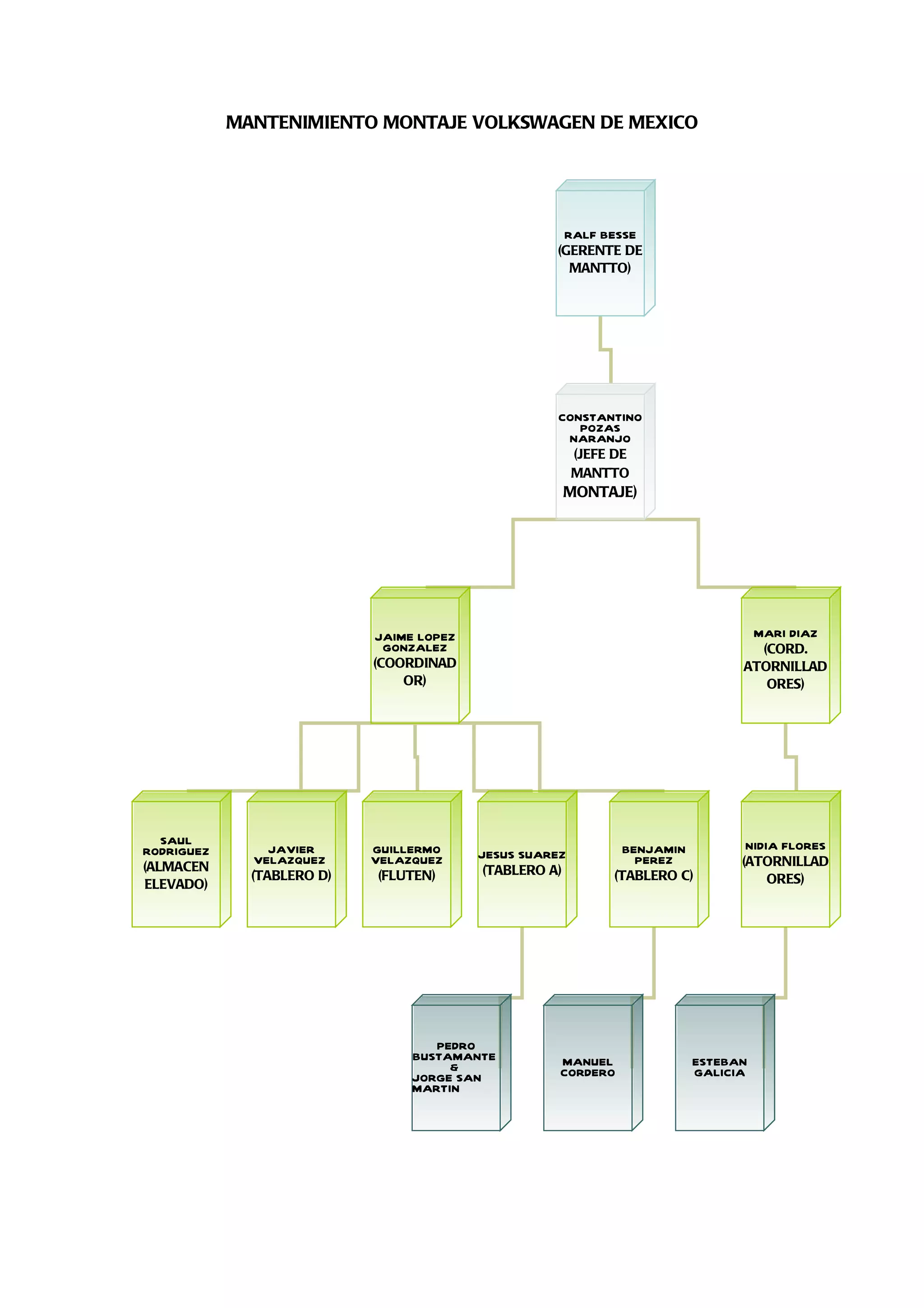 El documento presenta la estructura organizacional del departamento de mantenimiento de montaje de Volkswagen de México, con Ralf Besse como gerente de mantenimiento y Constantino Pozas Naranjo como jefe de mantenimiento de montaje, quien supervisa a varios coordinadores y jefes de diferentes áreas y procesos de producción.