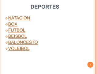 El documento describe 6 deportes populares: natación, boxeo, fútbol, béisbol, baloncesto y voleibol. Cada sección brinda una breve descripción del deporte, incluidas sus reglas y orígenes. La conclusión define deporte como una actividad física que involucra reglas y competencia dentro de un área designada.