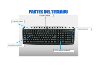 El documento describe cómo crear un diagrama de un teclado en Word que muestra sus partes y teclas principales. Se dividirá en dos partes, la primera mostrará las partes generales del teclado usando autoformas y texto. La segunda parte mostrará cada tecla principal del teclado explicando su función usando las mismas herramientas. Se recomienda usar el formato horizontal. Luego enumera las teclas principales y sus funciones de manera breve.