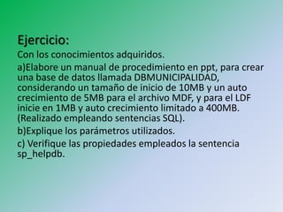 El documento describe los pasos para crear una base de datos llamada DBMUNICIPALIDAD con un tamaño inicial de 10MB y crecimiento automático de 5MB para el archivo MDF, y 1MB inicial con crecimiento limitado a 400MB para el archivo LDF usando sentencias SQL. Luego verifica las propiedades de la base de datos recién creada ejecutando la sentencia sp_helpdb.