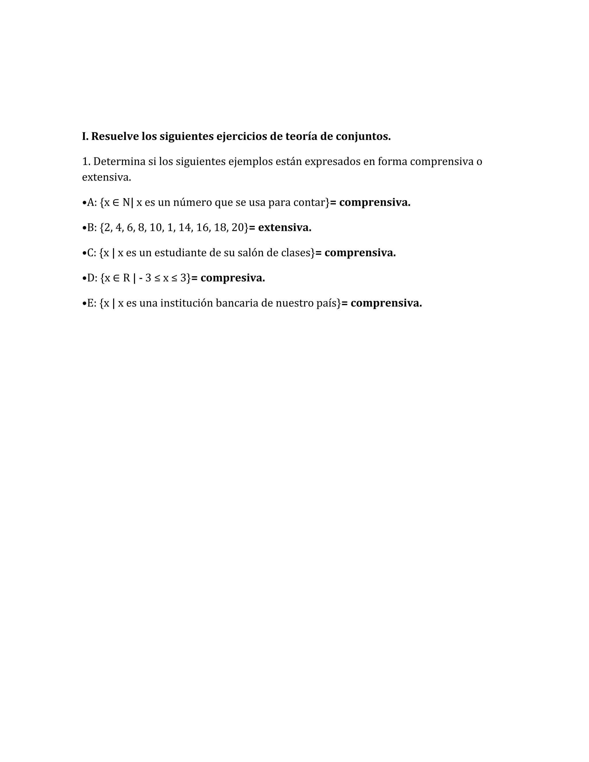 Este documento presenta varios ejercicios sobre teoría de conjuntos. En la primera sección, pide determinar si ciertos conjuntos están expresados de forma extensiva o comprensiva, y si otros son mutuamente excluyentes o no. La segunda sección presenta diagramas de Venn y pide resolver operaciones entre conjuntos. La tercera sección presenta más ejercicios similares sobre conjuntos.