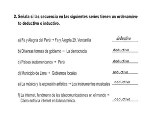 El documento presenta una serie de títulos y oraciones cortas sobre diferentes temas como deductivo, inductivo, números ordenados, verdad y falsedad de afirmaciones, rayos UV, un león, inteligencia y una biografía, seguidos en cada caso por una clasificación del tipo de orden usado como deductivo, cronológico, clasificatorio u otros.