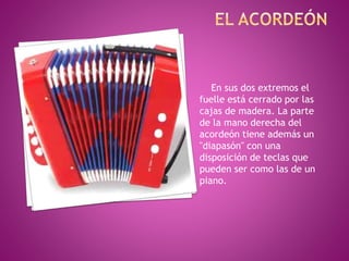 Este documento presenta breves descripciones de varios instrumentos musicales propios de Colombia, incluyendo el acordeón, la guitarra, las maracas y la flauta. Explica que el acordeón tiene cajas de madera en sus extremos y teclas en su lado derecho, la guitarra tiene una caja de madera con seis cuerdas sobre un diapasón, las maracas son esferas huecas llenas con pequeños objetos que producen sonido al sacudirse, y la flauta es un instrumento de viento sencillo.