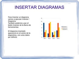 Este documento proporciona instrucciones sobre cómo insertar y formatear diagramas en Impress. Explica cómo insertar un diagrama usando el botón Insertar o Insertar / Diagrama y cómo cambiar los datos predeterminados haciendo clic en el botón Datos del diagrama. También describe cómo cambiar el tipo de gráfico seleccionando una opción en el cuadro de diálogo Tipo de gráfico y cómo agregar o eliminar filas y columnas. Además, explica cómo cambiar el fondo y borde de todo el diagrama o solo