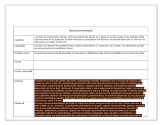 Este documento describe varias técnicas de enseñanza, incluyendo la expositiva, las efemérides, el periódico mural, la lectura comentada, el simposio, el círculo de Phillips, el panel, el diálogo, la argumentación, la interrogación, la observación, los círculos concéntricos, la cronología, la biografía, la discusión, la lluvia de ideas, el seminario, el estudio de casos y más. Cada técnica tiene un propósito diferente como impartir información, fomentar la