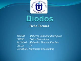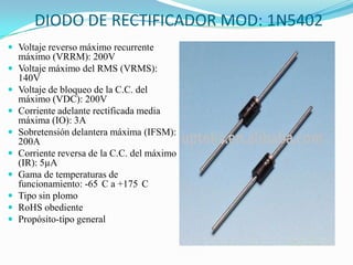 Este documento contiene las fichas técnicas de varios componentes electrónicos como diodos rectificadores, diodos láser infrarrojos, diodos LED de alta potencia y diodos zener. Cada ficha describe las características principales de cada componente como su voltaje máximo, corriente, temperatura de funcionamiento y otros parámetros eléctricos y ópticos.