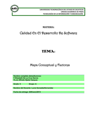 Este documento presenta un mapa conceptual y factores de calidad en el desarrollo de software. El mapa conceptual incluye institutos y normas de calidad como ISO, CMMI y SEIS SIGMA. Explica que la calidad del software es importante pero rara vez es perfecta. Los factores de calidad discutidos son funcionalidad, corrección, confiabilidad, eficiencia, usabilidad, mantenibilidad, portabilidad, robustez, compatibilidad y oportunidad.