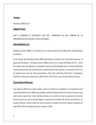 Este documento describe las características y mejoras de Windows Server 2008. Explica que es el sucesor de Windows Server 2003 y se basa en el núcleo Windows NT 6.1. Entre las mejoras se incluyen nuevas funcionalidades para Active Directory, soporte para más de 256 procesadores, y mejoras en virtualización, administración remota y seguridad. También describe algunas características técnicas como un nuevo proceso de reparación de archivos NTFS, creación paralela de sesiones de usuario, y protección contra malware.