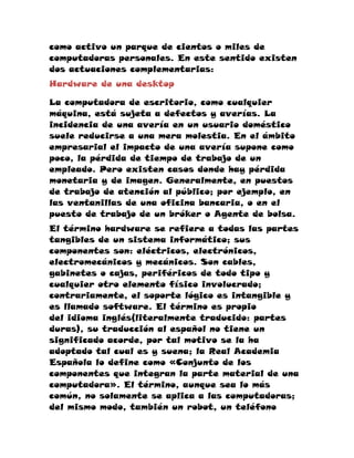 Una computadora de escritorio o desktop es una computadora fija diseñada para usarse en un escritorio, a diferencia de las portátiles. En el ámbito empresarial, las desktops son herramientas de trabajo importantes usadas para tareas productivas y administrativas. Las desktops requieren gestión y mantenimiento para prevenir averías que podrían causar pérdidas. Una tableta es un tipo de computadora portátil más grande que un teléfono pero más pequeña que una laptop, que se usa principalmente con la pantalla táctil.