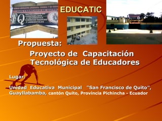 Este documento presenta una propuesta para un proyecto de capacitación tecnológica para los 60 docentes de la Unidad Educativa Municipal "San Francisco de Quito" en Ecuador. El proyecto busca aprovechar los recursos tecnológicos existentes como 3 laboratorios de computación con 70 computadoras para mejorar la formación de los docentes y estudiantes. El proyecto consistiría en cursos de capacitación informática para los docentes con el fin de que puedan enseñar de manera más efectiva utilizando la tecnología.