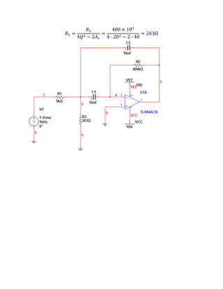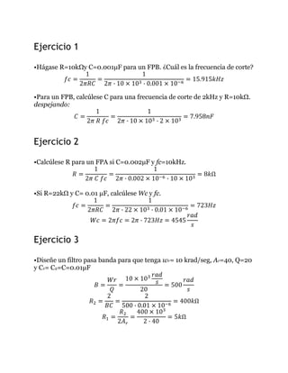 El documento presenta tres ejercicios de diseño y cálculo de parámetros de filtros pasivos. El primer ejercicio calcula la frecuencia de corte de un filtro pasa bajos dado R y C. El segundo calcula C para una frecuencia de corte dada R. El tercer ejercicio diseña un filtro pasa banda dadas sus especificaciones de ancho de banda, ganancia y factor de calidad.