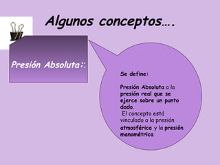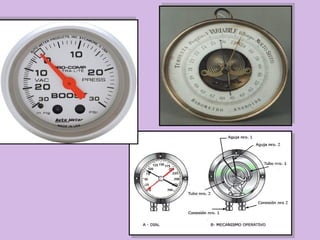 El documento describe los conceptos de presión atmosférica, presión absoluta, presión relativa y presión de vacío. Explica que la presión absoluta es la presión real que se ejerce en un punto, mientras que la presión relativa es la diferencia entre la presión absoluta y la atmosférica. También describe los diferentes tipos de instrumentos para medir la presión, como los mecánicos, electromecánicos, neumáticos y electrónicos. Finalmente, propone algunas actividades prácticas para medir y monitorear la