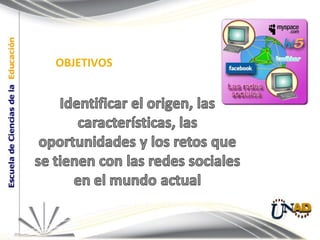 Este documento presenta una lección sobre redes sociales. Explica que las redes sociales son estructuras sociales compuestas de personas u organizaciones conectadas por relaciones. Describe las características de las redes sociales, incluyendo que unen a personas con intereses comunes y que mantienen relaciones que se fortalecen con el tiempo. También analiza los retos y oportunidades de las redes sociales, como la difusión de ideas pero también riesgos relacionados con la privacidad.
