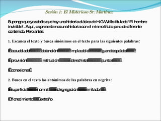 El documento explora la historia del misterioso Sr. Martínez y las actividades que realiza cuando nadie lo ve. Se presentan ejercicios de lectura y vocabulario, además de reflexiones sobre la invisibilidad y la identidad. A lo largo del texto, se destacan temas sobre creatividad, sinónimos y antónimos, y la importancia de la expresión personal.