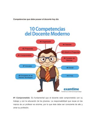 El documento discute las Tecnologías de la Información y la Comunicación (TIC), las cuales son un conjunto de tecnologías para gestionar y enviar información de un lugar a otro. También describe las competencias clave que debe poseer un docente moderno, incluyendo estar comprometido con los estudiantes, preparado académicamente, e innovador y entusiasta sobre las nuevas tecnologías. Además, analiza cómo las nuevas concepciones del aprendizaje con TIC están cambiando los roles de los docentes.