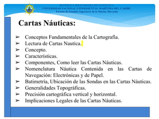 Este documento resume los conceptos fundamentales relacionados con las cartas náuticas. Explica que las cartas náuticas son representaciones gráficas de porciones de tierra y agua que incluyen detalles como la batimetría, características topográficas y ayudas a la navegación. También describe los componentes, simbología, precisión y actualización de las cartas náuticas.