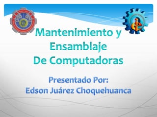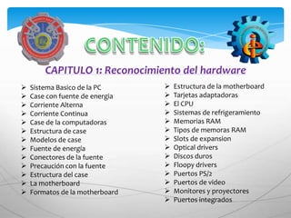 El primer capítulo cubre el reconocimiento de hardware interno de una PC como la placa base, tarjetas de expansión, CPU y sistemas de enfriamiento. El segundo capítulo trata sobre el ensamblaje de una computadora, incluyendo cómo conectar periféricos. El tercer capítulo habla sobre el mantenimiento del hardware de una computadora y las herramientas necesarias.