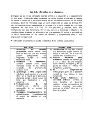 Este documento presenta información sobre el uso de la tecnología en la educación. Explica las ventajas e inconvenientes de las herramientas tecnológicas en el aprendizaje. También evalúa dos software educativos, Ed modo y Muy Educativo, destacando sus características interactivas y su capacidad para apoyar diferentes modelos pedagógicos. Finalmente, expresa una opinión personal sobre el potencial positivo de la informática en la educación si es utilizada correctamente.