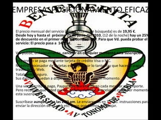 El documento presenta tres propuestas de empresas para posicionamiento web. La empresa Posicionamiento Eficaz cobra 14,95€ al mes por un criterio de búsqueda con descuento del 25% el primer mes y pago mediante Paypal. La empresa Mexpáginas cobra 1,000 pesos anuales por posicionar una página entre los primeros 10 resultados de Google México. WebMediterr@nea ofrece posicionamiento natural por 255€ o posicionamiento en primeros resultados de Google por 90€ al mes con seguimiento mensual.
