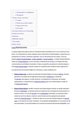 La biotecnología se define como la tecnología basada en la biología, especialmente usada en agricultura, farmacia, ciencia de los alimentos, medio ambiente y medicina. Tiene aplicaciones en áreas como la salud, la agricultura, la industria y el cuidado ambiental a través de procesos como la biorremediación. Algunos riesgos de la biotecnología incluyen efectos en la salud humana y ambientales como la posible dispersión de cultivos modificados genéticamente y el desarrollo de