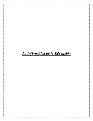 El documento aborda el impacto de la informática en la educación, destacando su evolución y la importancia de integrar tecnologías en el proceso de enseñanza-aprendizaje. Se discuten conceptos clave de la informática educativa, su papel en la mejora del aprendizaje significativo y las competencias necesarias para su efectivo uso en el aula. Además, se analizan diversas aplicaciones tecnológicas actuales, como campus virtuales y redes de aprendizaje, que enriquecen la experiencia educativa.