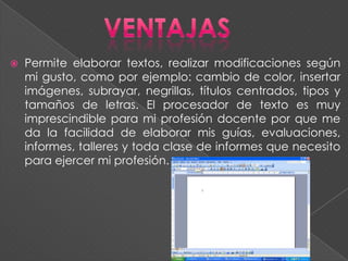Este documento describe las funciones y utilidad de los procesadores de texto. Menciona que permiten editar textos fácilmente mediante funciones como cambiar color, insertar imágenes, subrayar, usar negritas y títulos centrados. También describe los procesadores de texto más conocidos como WordPad, Word y OpenOffice, y explica pasos básicos como abrir Word, guardar documentos y utilizar funciones como cursor, editar, cortar, pegar y copiar.