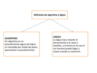 Este documento define algoritmos y lógica. Explica que un algoritmo es un procedimiento seguro para lograr un resultado a través de pasos definidos y que la lógica se refiere a la forma en que los humanos razonan. Describe las características de los algoritmos como tener un inicio y fin, ser claros y definidos, y ser generalizables. Además, detalla los tipos de algoritmos cualitativos y cuantitativos y los pasos para resolver un problema por computadora.