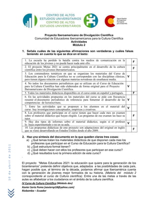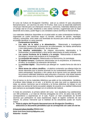 Este documento describe el Curso de Educación para la Cultura Científica, un proyecto dirigido a educadores iberoamericanos. Los materiales didácticos están organizados en siete contenedores temáticos y cubren temas de salud, medio ambiente, tecnología, espacio y sociedad digital. Los profesores deben trabajar con al menos un material cada mes y reportar su experiencia. La primera edición tuvo éxito con 400 profesores y más de 50,000 estudiantes participando.