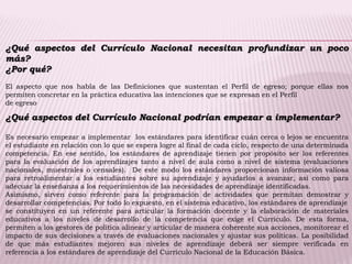 El documento propone implementar aspectos del Currículo Nacional en tres pasos. Primero, profundizar en las definiciones del Perfil de Egreso. Segundo, comenzar a implementar los estándares de aprendizaje para evaluar el progreso de los estudiantes. Tercero, los docentes trabajarán en grupos para desarrollar programaciones basadas en los estándares e instrumentos de evaluación, además de coordinar con personal de apoyo para estudiantes con necesidades especiales.