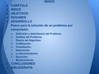 Este documento describe los nueve pasos para resolver problemas por computadora: 1) definir y delimitar el problema, 2) analizar el problema, 3) diseñar el algoritmo, 4) codificar, 5) compilar, 6) depurar, 7) documentar, 8) ejecutar, y 9) mantener. Cada paso incluye instrucciones específicas como definir los datos de entrada y salida, determinar los cálculos requeridos, y escribir el código del programa.