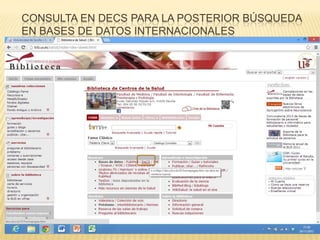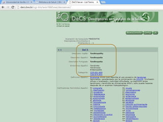 El documento describe una tarea sobre el tratamiento y prevención de las tendinitis en los deportistas. Explica consultar el tesauro DECS para buscar información en bases de datos internacionales sobre este tema. Luego detalla estrategias de búsqueda usadas en las bases de datos CINAHL y SPORTDiscus para encontrar artículos sobre la prevención, tratamiento y terapia de tendinopatías en atletas.
