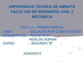 Este documento presenta los pasos para resolver un problema por computadora. Incluye 7 pasos: 1) planificación y delimitación del problema, 2) análisis del problema, 3) diseño del algoritmo, 4) codificación, 5) compilación, 6) depuración, y 7) ejecución y mantenimiento. Cada paso depende del anterior y requiere cuidado en su elaboración para resolver problemas de manera exitosa por computadora.