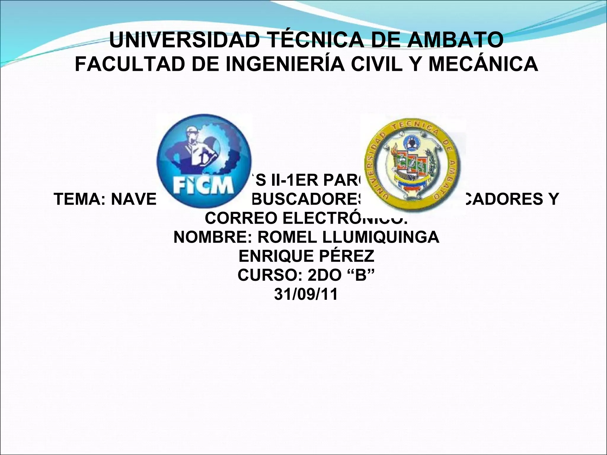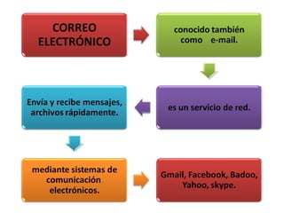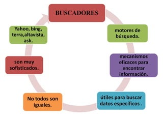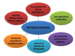 Este documento describe las características de navegadores web, buscadores, metabuscadores y correo electrónico. Explica que son herramientas útiles para encontrar información en Internet y varían en sus funciones y tamaños de base de datos. Luego proporciona ejemplos de populares navegadores, buscadores, metabuscadores y servicios de correo, concluyendo que el objetivo es comenzar a conocer estas herramientas y sus características principales.