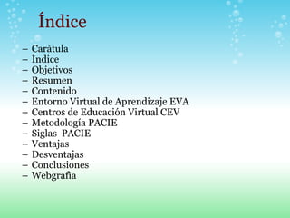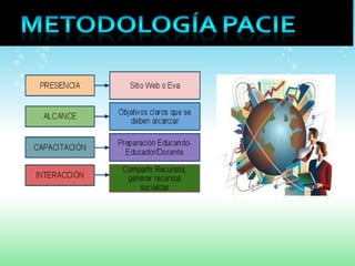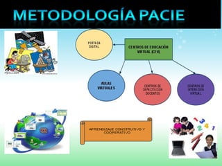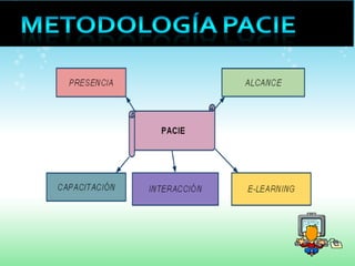La Metodología PACIE es un método educativo creado por Pedro Camacho que utiliza las TIC para crear un aprendizaje cooperativo mediante Centros de Educación Virtual con tutores capacitados. PACIE se basa en la presencia, alcance, capacitación, interacción y uso de la tecnología para mejorar la educación.
