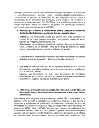 Este documento describe herramientas para la creación y publicación de contenidos educativos digitales. Define las herramientas IMS y SCORM, que permiten crear paquetes de contenido estandarizados que pueden importarse en diferentes sistemas de gestión del aprendizaje. También menciona cinco herramientas como Ardora, Constructor, Cuadernia, EdiLimes y Lams, resaltando las características de cada una. Finalmente, proporciona una descripción detallada de la herramienta eXeLearning, incluyendo sus caracterí