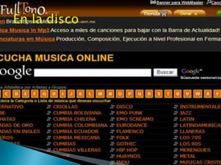 El formato mp3 se desarrolló en 1978 y se popularizó en 1992, lo que permitió comprimir archivos de audio digitales hasta 12 veces su tamaño original. Esto llevó a la creación de portales de música en línea y al desarrollo de dispositivos electrónicos como celulares y cámaras con soporte para mp3. Los sitios web como www.fulltono.com y www.enladisco.com ofrecen música en formato mp3 organizada por géneros, artistas y canciones que pueden ser buscadas y escuchadas.