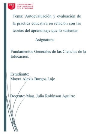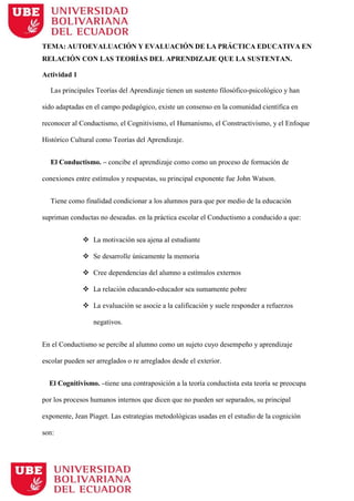 Este documento discute la autoevaluación y evaluación de la práctica educativa en relación con las teorías del aprendizaje. Explica las principales teorías del aprendizaje como el conductismo, cognitivismo, humanismo, constructivismo y enfoque histórico-cultural. También describe que la autoevaluación de la práctica educativa debe considerar la interactividad en el aula, los objetivos curriculares y el conocimiento disciplinario y pedagógico del docente.