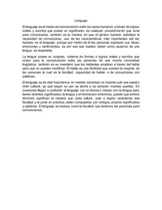 Este documento define varios conceptos clave relacionados con el lenguaje. Explica que el lenguaje es el medio de comunicación entre los seres humanos a través de signos orales y escritos. La lengua se refiere al conjunto de formas o signos de una comunidad lingüística, mientras que el habla es la capacidad individual de comunicarse usando una lengua. También distingue entre lengua e idioma, señalando que un idioma tiene implicaciones políticas y geográficas que no tiene una lengua.