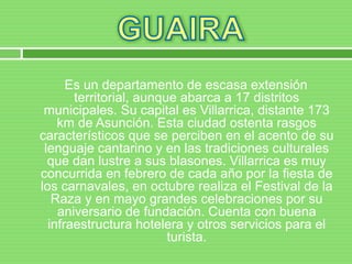 El documento resume información sobre el departamento de Guairá en Paraguay. Guairá tiene una extensión territorial pequeña pero abarca 17 distritos municipales. Su capital es Villarrica, conocida por sus tradiciones culturales como el carnaval en febrero y el festival de la raza en octubre. La economía de Guairá se basa en la agricultura, incluyendo caña de azúcar, tabaco y ganadería.