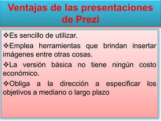 Este documento describe las ventajas y desventajas de usar Prezi para presentaciones. Entre las ventajas se encuentran que es sencillo de usar, permite insertar imágenes y la versión básica es gratuita. Algunas desventajas son que requiere conexión a Internet y solo está disponible en inglés. El aspecto más difícil es darle animación a la presentación.