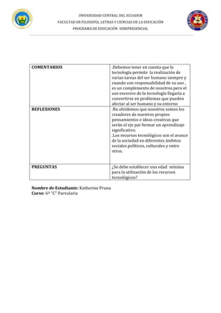 Este documento discute los posibles problemas, causas y efectos del aprendizaje en línea en varias áreas como la pedagogía, sociología, psicología, política, ideología, tecnología, educación y cultura. Algunos de los problemas identificados incluyen una separación entre la teoría y la práctica educativa, la falta de trabajo en grupo y la dependencia de los recursos tecnológicos. Se argumenta que la tecnología debe usarse de manera responsable como un complemento de la educación tradicional para lograr un