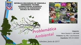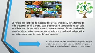 Este documento presenta información sobre la biodiversidad, incluyendo diferentes tipos de diversidad (genética, de organismos y ecológica), causas de la pérdida de biodiversidad, consecuencias de esta pérdida, soluciones para preservar la biodiversidad y organismos encargados de la defensa del medio ambiente en Venezuela de acuerdo a su constitución. También se mencionan especies en peligro de extinción y la gran biodiversidad que caracteriza a Venezuela.